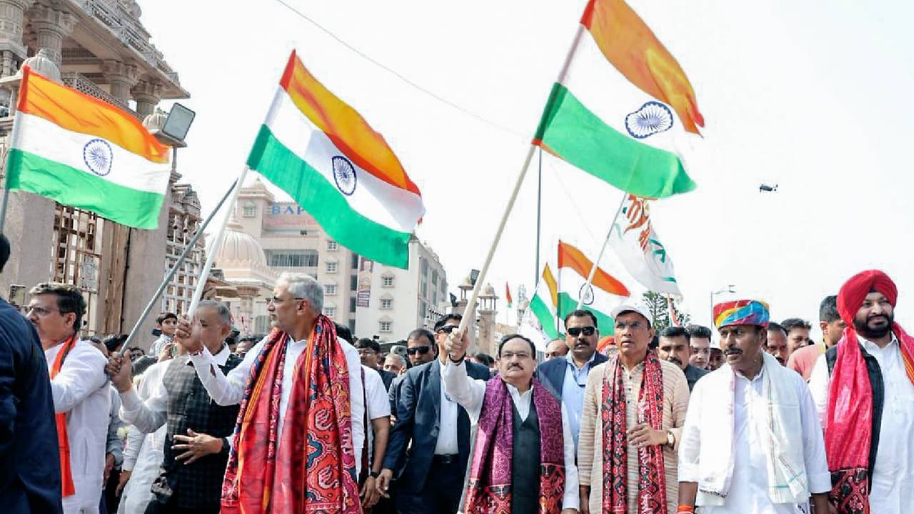 Union Minister for Labor and Employment, Youth Affairs and Sports, Mansukh Mandaviya and Union Minister for Commerce and Industry, Piyush Goyal pose for a photograph with child actors and artistes during the Unity March organized as part of the 150th birth anniversary celebrations of Sardar Vallabhbhai Patel, in Vadodara on Saturday.