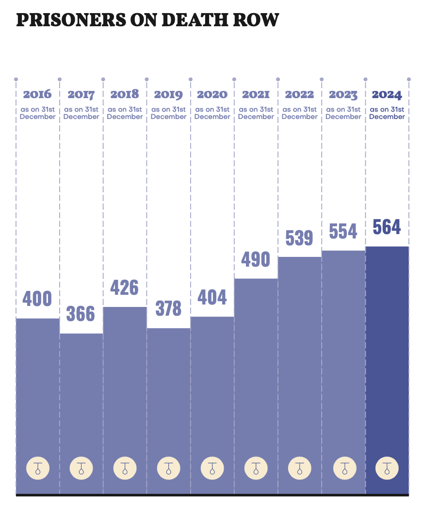 India occupies a complex position in this global landscape. At the end of 2024, 564 prisoners were living under a sentence of death — the highest number in nearly two decades, according to the National Crime Records Bureau (NCRB). Trial courts imposed 139 new death sentences during the year, up from 120 in 2023.