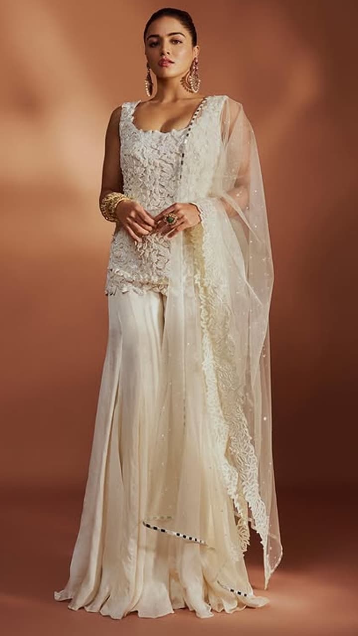 If you want a modern touch with traditional, then try this sequin border work white satin suit design. This gives sheer style and light embellishment.