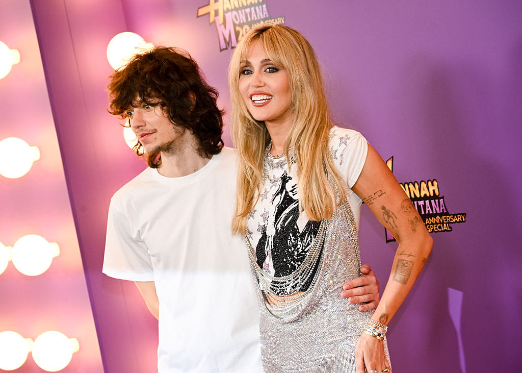 Maxx Morando and Miley Cyrus attend the World Premiere of Disney+’s “Hannah Montana 20th Anniversary Special” at El Capitan Theatre on March 23, 2026 in Los Angeles, California. (Photo by Amy Sussman/Getty Images)