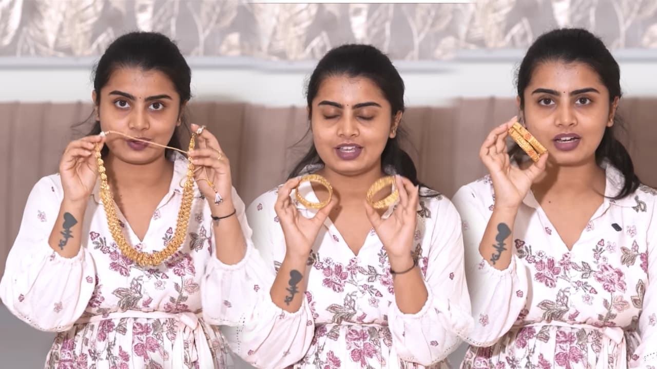 These days, YouTubers are putting everything on social media, not thinking twice about keeping things private. Now, Kannada YouTuber Madhu Gowda has uploaded a video showing off her entire gold collection, and viewers are stunned.<img>She reveals she hasn’t worn her choker much. She had bought the choker and a long necklace for her wedding. Her husband Nikhil also gifted her a ring for her birthday. Her collection includes a diamond ring and necklace too.<img>Madhu Gowda showed off her entire collection, which includes bangles, chains, earrings, and necklaces. She admits that she hasn’t even worn many of these pieces yet.<img>Viewers were stunned to see the collection. Her wedding ‘thali’ chain alone weighs 55 grams. Apparently, this particular design is in very high demand right now.<img>Many viewers commented that they don’t even own that much artificial jewellery. Some warned her that showing off her gold like this could attract the ‘evil eye’. Still, many others praised her for sharing the video.<img>Despite some people warning her about the ‘evil eye’, Madhu Gowda went ahead and uploaded the video of her gold collection, for which many of her followers have praised her.
