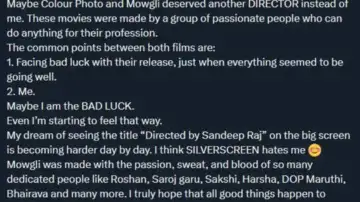 Sandeep Raj considers himself ‘Bad Luck’ for his films. He penned a note on X that read, “Maybe Colour Photo and Mowgli deserved another DIRECTOR instead of me. These movies were made by a group of passionate people who can do anything for their profession. The common points between both films are: 1. Facing bad luck with their release, just when everything seemed to be going well. 2. Me. Maybe I am the BAD LUCK. Even I’m starting to feel that way. My dream of seeing the title “Directed by Sandeep Raj” on the big screen is becoming harder day by day. I think SILVERSCREEN hates me. Mowgli was made with the passion, sweat, and blood of so many dedicated people like Roshan, Saroj garu, Sakshi, Harsha, DOP Maruthi, Bhairava and many more. I truly hope that all good things happen to Mowgli at the very least for their sake.” (sic)