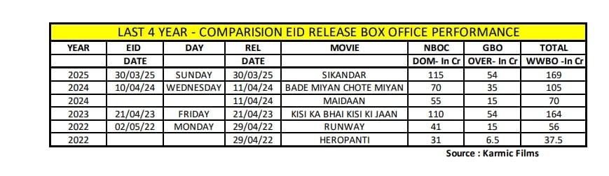 The year 2023 saw the release of Kisi Ka Bhai Kisi Ki Jaan, which earned Rs 164 crore worldwide, but still fell short of the blockbuster scale historically associated with Eid releases. Movies like Bade Miyan Chote Miyan and Maidaan, which were released in 2024, earned Rs 105 crore and Rs 70 crore, respectively, indicating a soft festival window. While Sikandar performed better last year, it still did not reach the historic Eid blockbuster benchmark, with approximately Rs 169 crore worldwide.