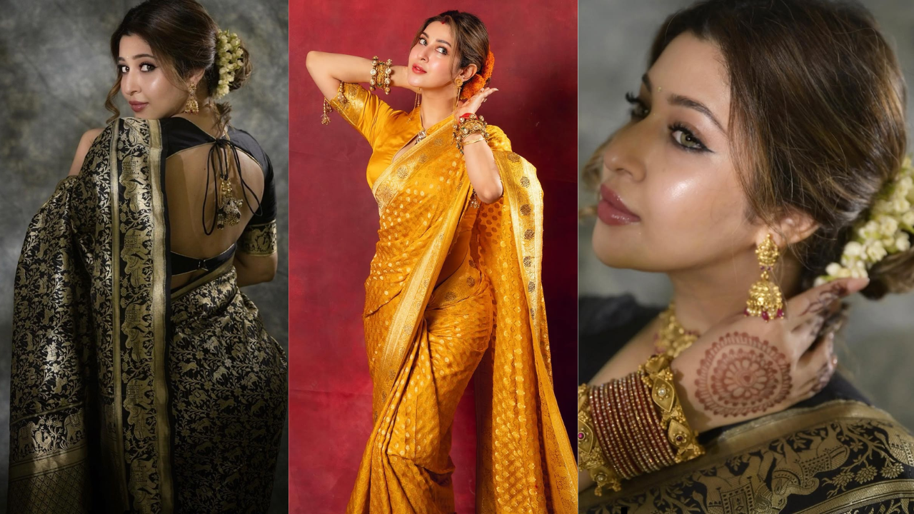 Do not experiment too much with silk or Banarasi saree. Here Sonarika has made a low bun with two different sarees. With the help of donut such a look can be created easily. Flowers have been used here, if you want you can also add hair accessories.