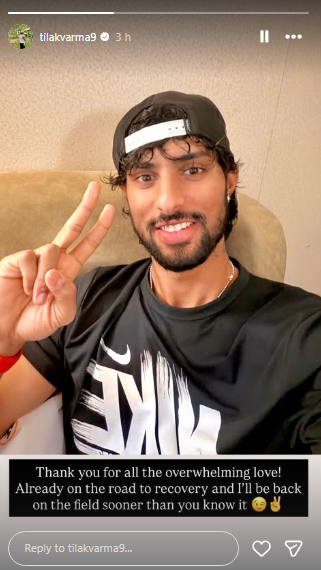 After the news of his emergency abdominal surgery surfaced, Tilak Varma gave a crucial update to the fans and the Indian cricket fraternity about his health. Taking to his Instagram story, the southpaw expressed his gratitude for concerns and love, adding that he has already begun his road to recovery.