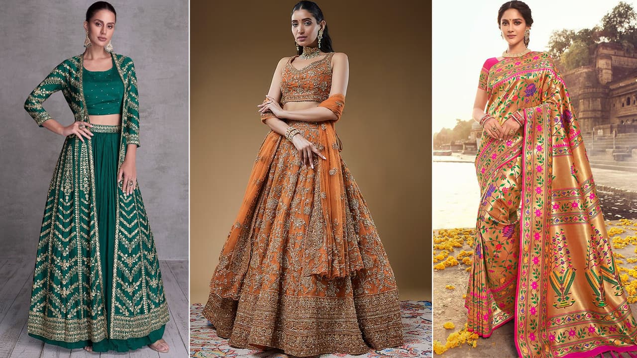 For those who don’t want a very heavy lehenga, Sharara or Garara sets are perfect. They are light, graceful and comfortable for the dance floor. With mirror work, zari and silk fabric, these sets give a traditional and classy look. Sharara sets in gold or pastel tones are best for a day wedding.