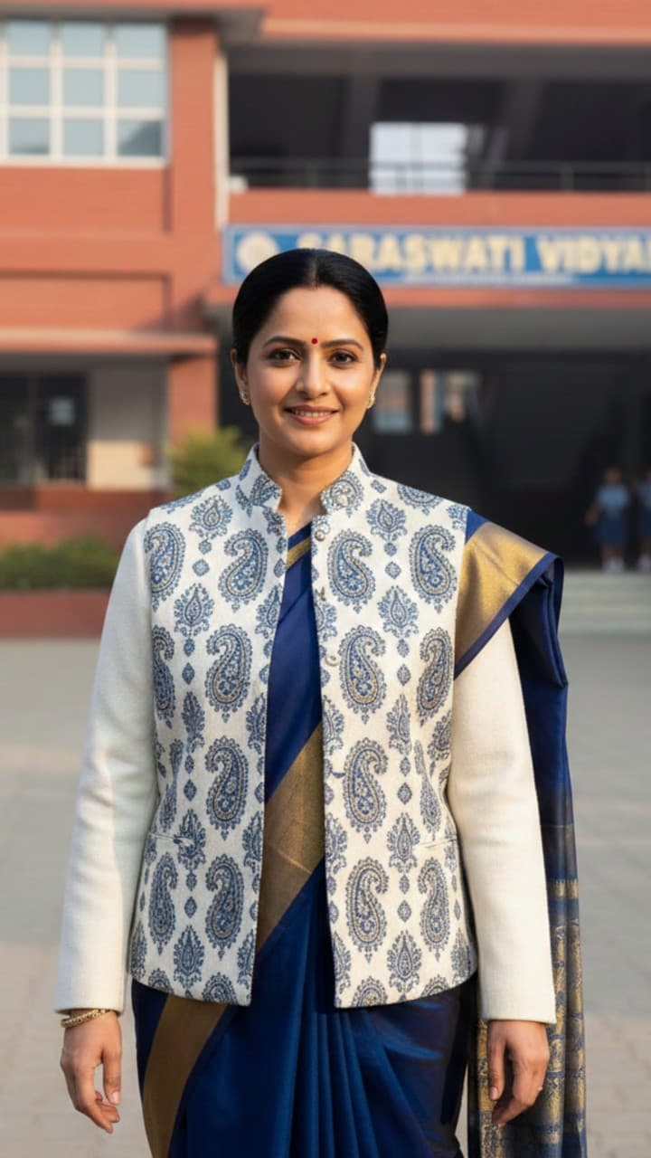 This Nehru with mandarin neckline comes in indigo and block pattern. Such a jacket will look lovely on women of all ages. You can choose it with matching earrings, bun or braid hairstyle.