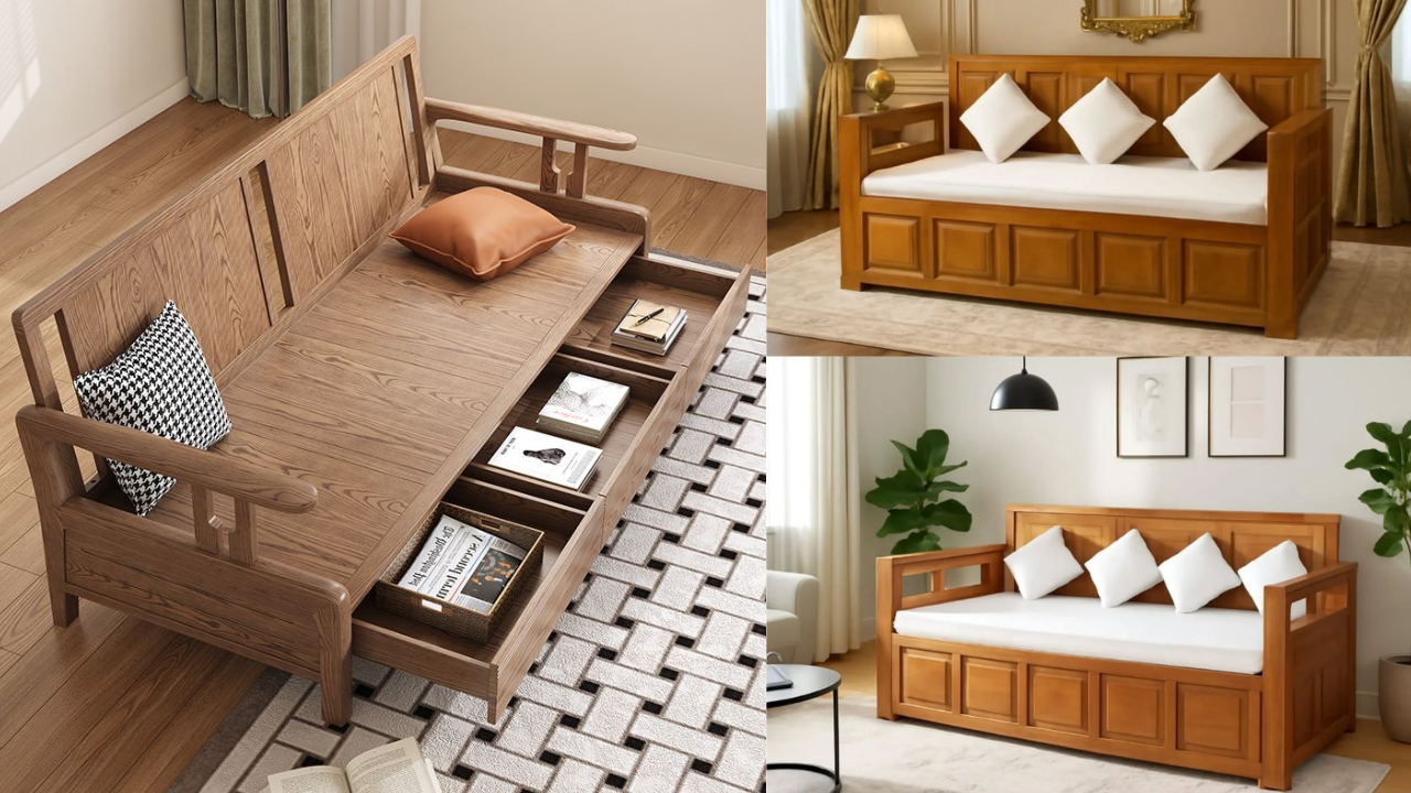 Wooden Sofa Set Cum Bed Designs: If you don’t have the budget to buy a modern sofa set and separate wardrobe, then check out the wooden sofa designs, it comes in hydraulic storage, sofa cum bed and diwan style. Which will give a premium look to the living room.