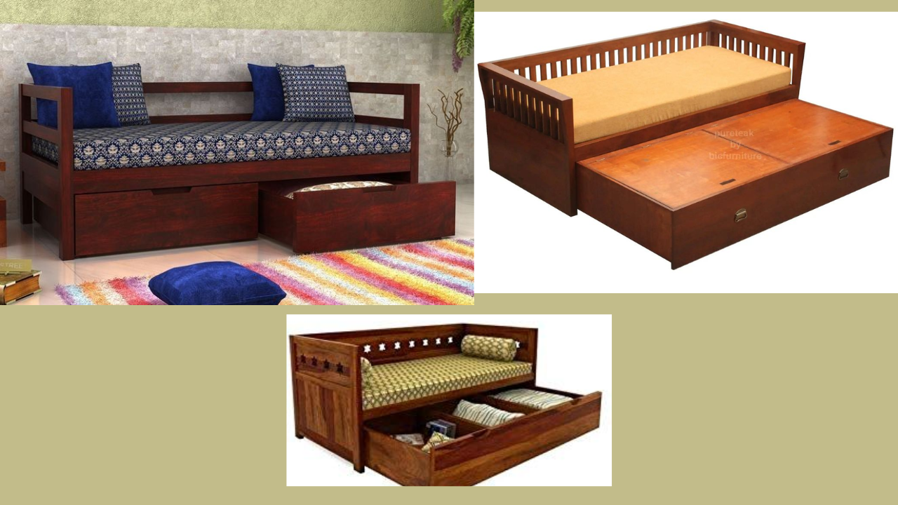 Two different types of sofa bed storage designs are shown in the picture. These are specially designed for small houses and living rooms. The wooden work with teak polish is giving it a distinct shine. These come in modern with traditional combination. The side wooden panels at the back will give a sofa look. Its biggest feature is the pull out drawers, in which goods can be kept.