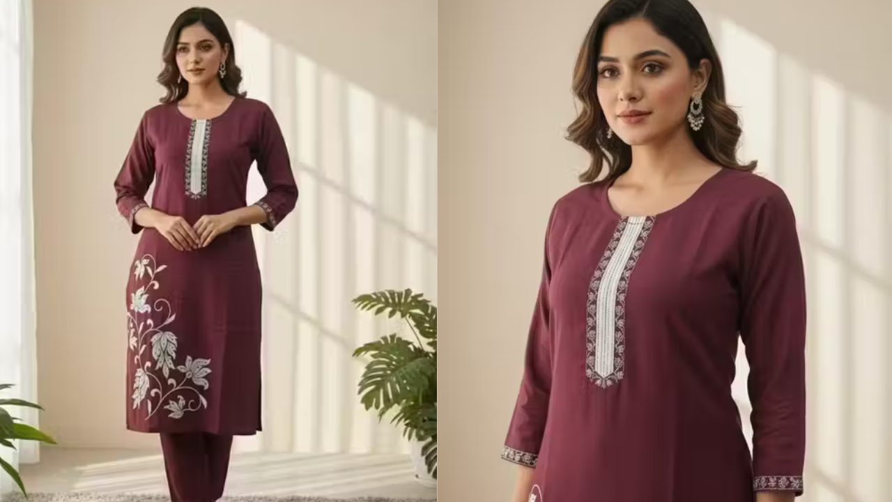 Coming in maroon color, this kurta set can be a perfect choice for office wear. This suit with round neckline, 3\4 quarter sleeves, embroidery pattern is fancy and comfortable. This has also been made on wool fabric. Apart from maroon, black color option is also available here. You can choose it in sizes S, M, L and XL. It is worth noting that this suit comes without dupatta. You can give it a beautiful look by styling it with a contrast shawl. Its price on Meesho is only ₹375.