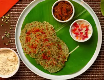 • Combine all flours, chopped methi leaves, onion, green chili, ginger, ajwain, and salt in a mixing bowl.