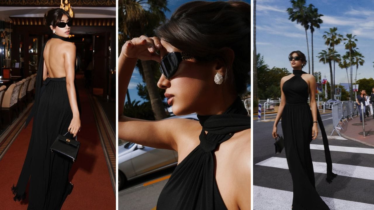 For an off-duty Cannes appearance, Janhvi opted for a jet-black halter dress from Yves Saint Laurent’s Rive Gauche 1975 collection. The archival piece featured a backless silhouette and flowing scarf detail, channelling retro glamour through lightweight fabric and timeless tailoring.