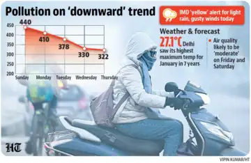 Light rain is expected over Delhi due to a western disturbance, even as the winter chill has eased over the past few days, with Thursday recording the warmest January day in seven years with a maximum temperature of 27.1 degrees Celsius.