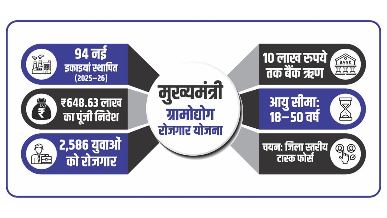 So far, 94 village industry units have been established under this scheme in the financial year 2025–26. Through this, capital investment of ₹ 648.63 lakh has been made possible. These units have provided direct employment to 2,586 youth in rural areas of the state. This achievement shows that the scheme is being implemented effectively at the grassroots level.