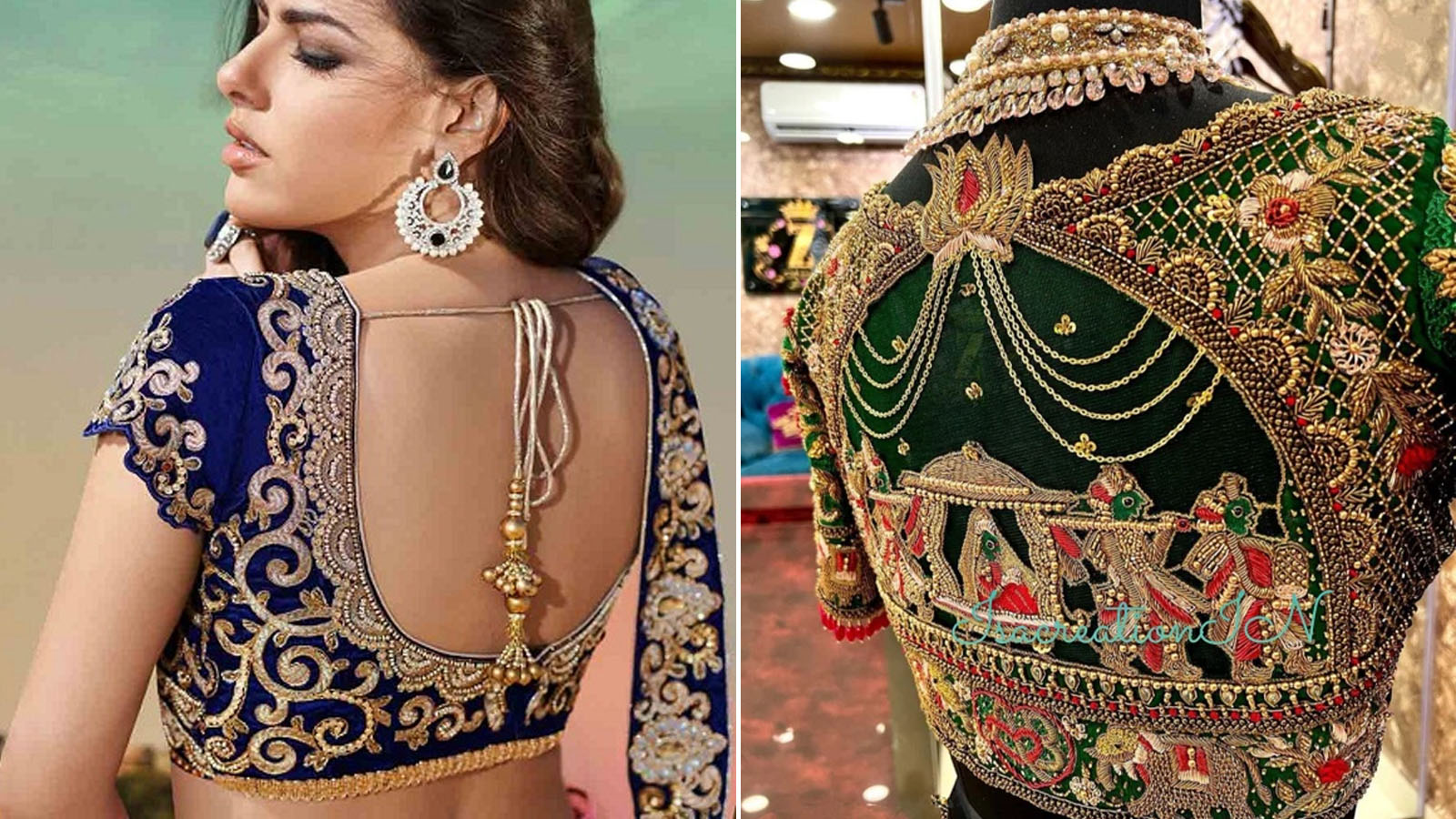 If you are a bride who wants to keep a touch of Indian culture in her outfit, then definitely try the Maggam Work Blouse with temple border. This design is completely inspired by South Indian temple architecture and old stories. In these, small motifs of Ramayana/Krishna Leela are made. It makes the whole look of your saree spiritual and fabulous.