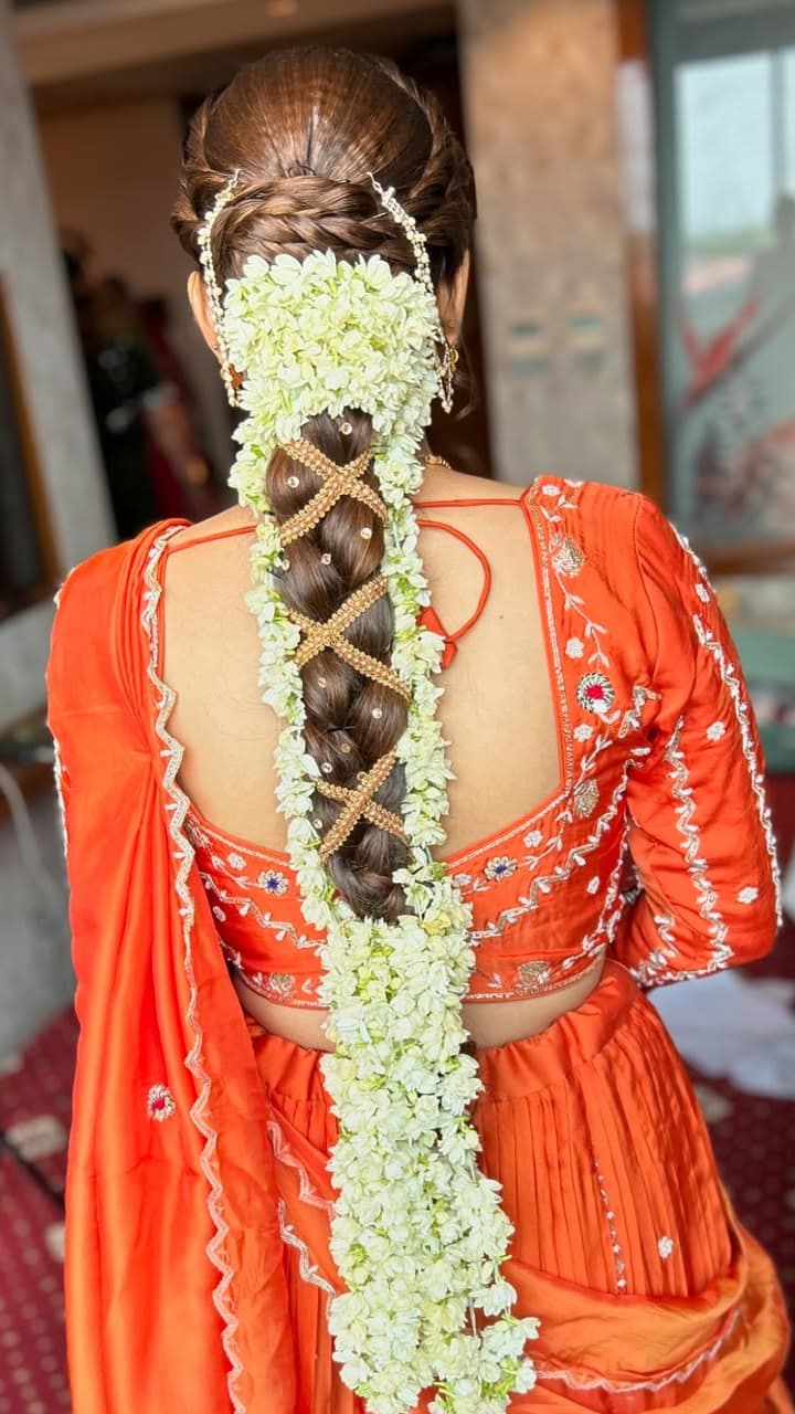 Make a messy braid in your open curly hair and attach the multi-layer gajra strands to the hair like this. This will not only give a beautiful look, but will also give a wonderful fragrance.