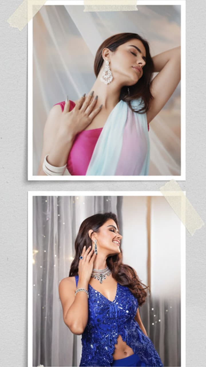 If you like heavy earrings, then you can also wear chandelier earrings like Priyanka Chahar Chaudhary, which has three droplet jhumkis.